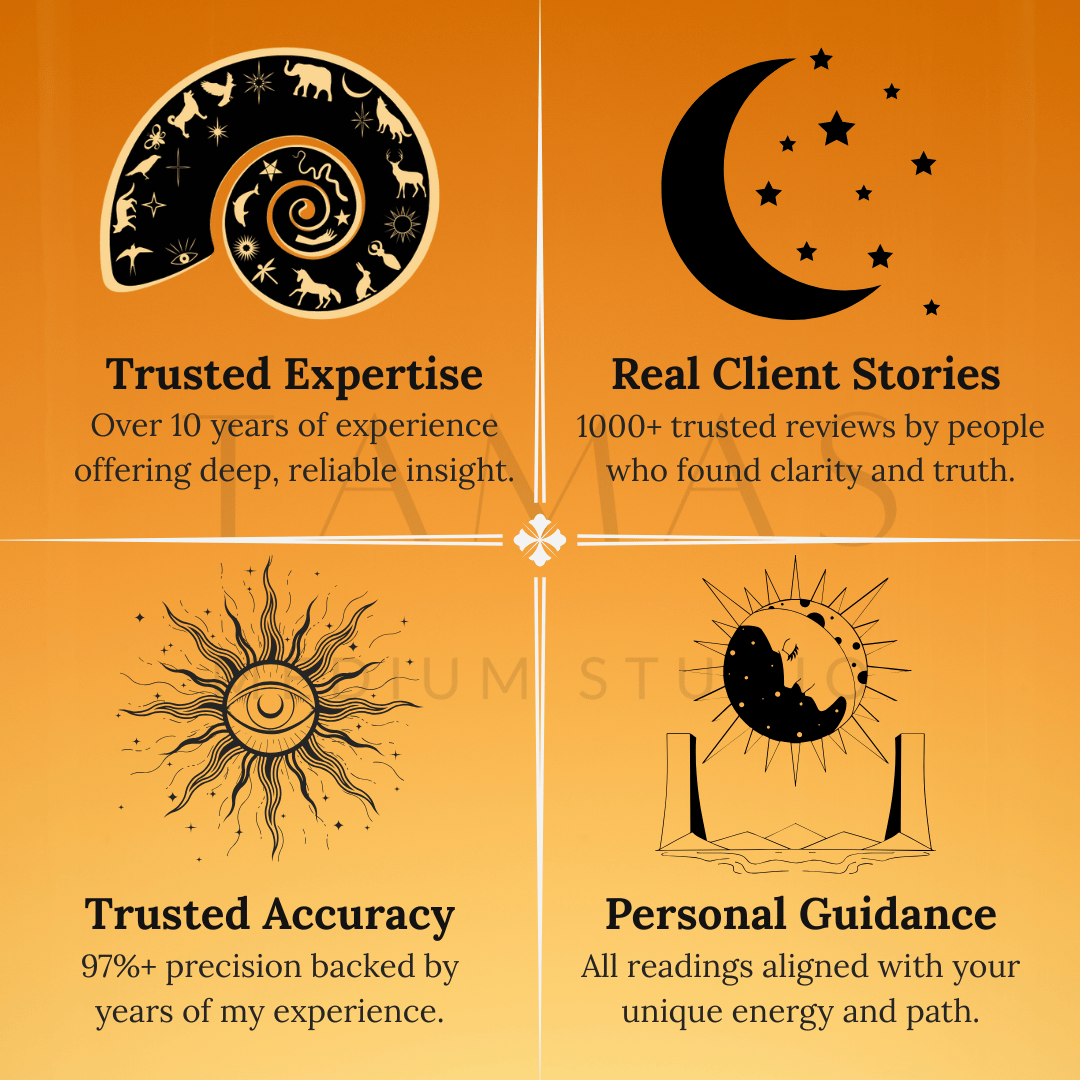 I have full confidence in my abilities and the accuracy of my readings, which is why I offer a risk-free guarantee to ensure you feel confident in choosing a reading today.